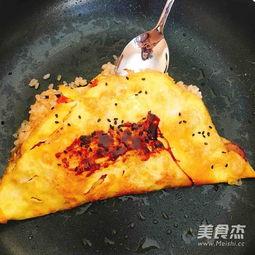 - 包饭:将炒好的米饭放在煎好的蛋皮上,对折成半圆形,用铲子轻轻压实,使蛋皮紧贴米饭。